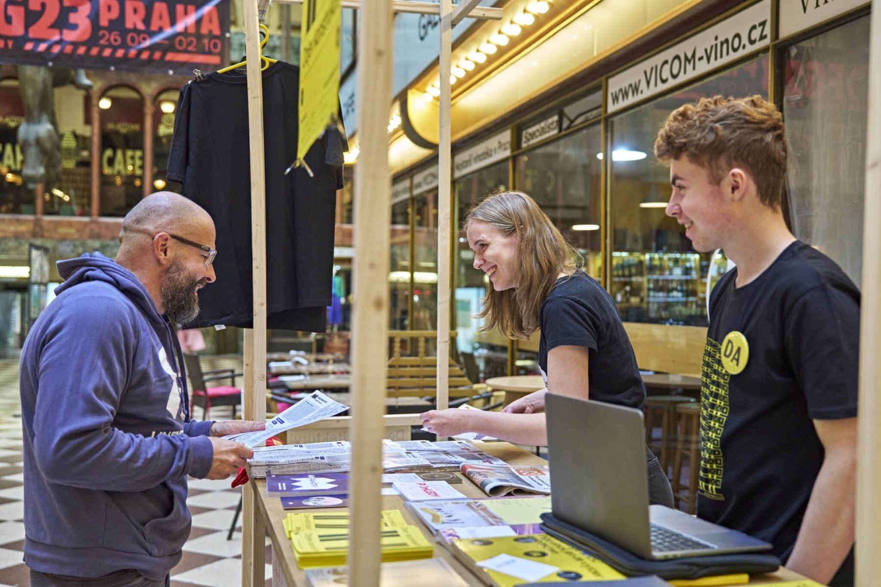 Infostánek, kde je možné si vyzvednout tištěné programy festivalu, nebo si nechat poradit od našich dobrovolníků. Je možné si zde také zakoupit festivalová trika, plátěnky a další.